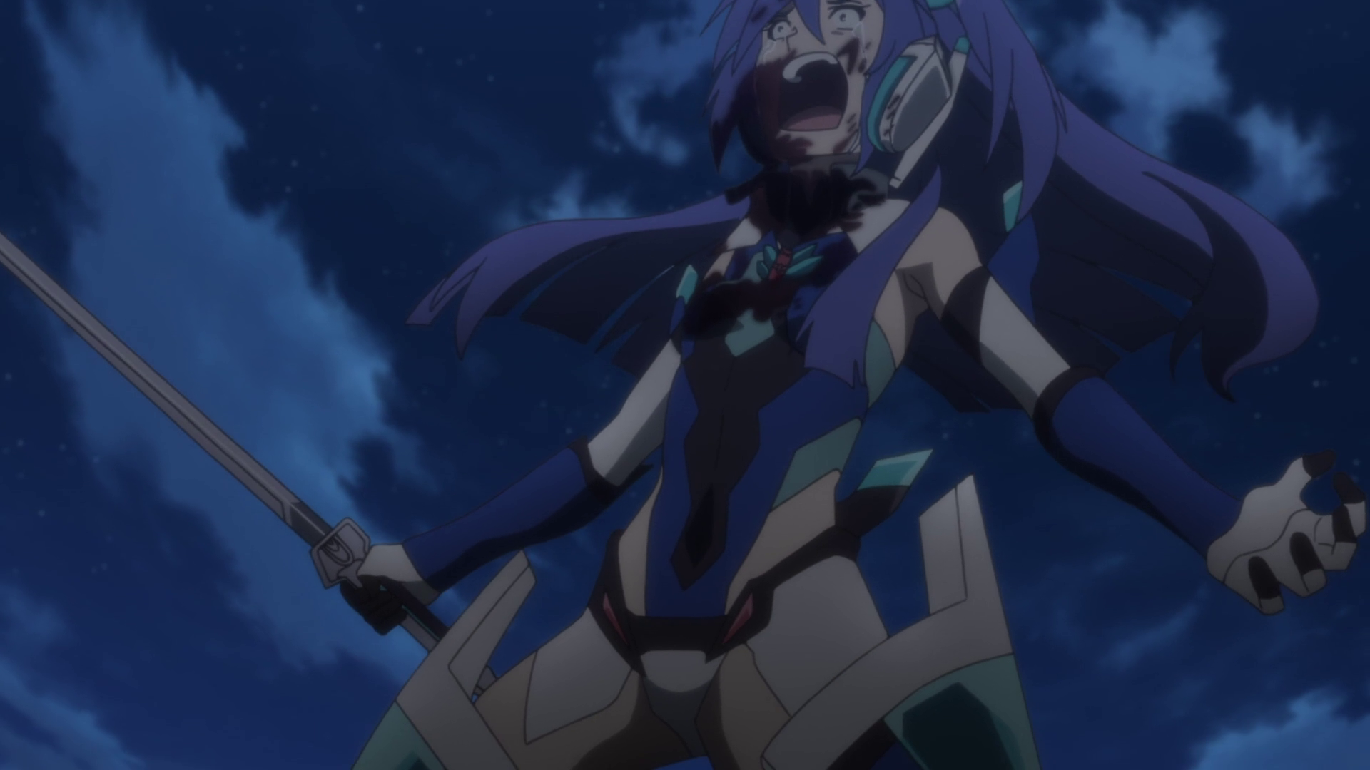 Ah, the duality of Symphogear openings. The first two seasons opened with cryptic in media res flashbacks/flashforwards to show tragedy and death, an eyebrow-raising mystery to make a viewer curious and keep their attention. The two after that were bombastic action setpieces to get you absolutely hyped for the show ahead. What approach does XV take? Both. The majority of episode 1 will be dedicated to a bombastic action setpiece, but the actual opening is indeed a cryptic flashback with no context. I've played my hand already, in the future, if I've done it right, and just to the right of these words should be the literal third shot of the series. To use an entirely loaded term, XV is going full Old Testament and moving back to its roots. Seasons 3 and 4 were very good, but there was one thing they held back on. One thing the first two seasons almost revelled in, and the one thing XV brings back. That's right. Bloody violence. The red stuff.